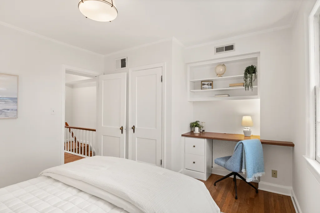 Both bedrooms are well-proportioned, including a versatile second bedroom with built-in desk, perfect for today’s work-from-home needs. The home balances original charm with everyday livability in a setting that feels both quiet and connected.